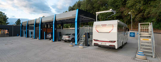 Die neue Anlage bietet vier überdachte Waschplätze sowie einen großzügigen Freiwaschplatz – speziell für Wohnmobile, Wohnwagen oder Lieferwagen. Mit einer nutzbaren Fläche von 4,40 Metern Breite und 7,50 Metern Länge ist er ideal für großformatige Fahrzeuge. Was diesen Waschplatz besonders praktisch macht: Seitliche Stege erstrecken sich auf beiden Seiten über die gesamte Länge des Waschplatzes. Über Stufen gelangt man auf diese erhöhten Balkone, die eine komfortable, sichere Reinigung des Fahrzeugdachs bieten. So gelingt selbst die Dachwäsche von Wohnmobil & Co mühelos und effektiv.